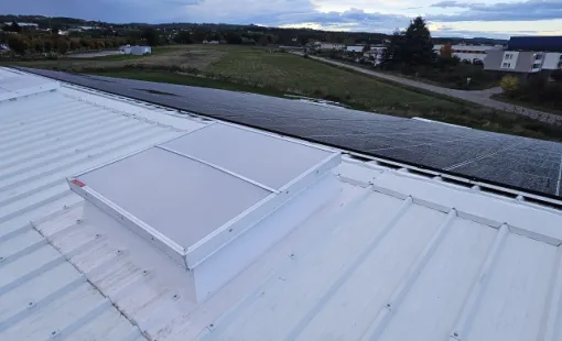 installation de skydome sur une toiture pour une bâtiment pour l'aérodrome d'Andrézieux Bouthéon. Les skydomes servent principalement à apporter de la lumière naturelle et à assurer le désenfumage…